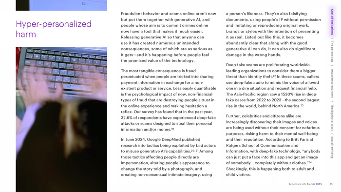 1.犹豫的代价:数字技术的可信度正受到威胁,因为诈骗的增加模糊了真实和欺骗性内容之间的界限。生成式人工智能正在放大这种困惑,挑战人们对数字平台的信任。埃森哲的研究显示,超过一半的人现在质疑在线内容的真实性。信任侵蚀正在影响在线购物和品牌互动,33%的人在过去一年中报告了深度虚假攻击或诈骗。