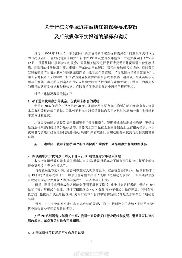 说明中称,晋江文学城于2024年12月2日收到自称“浙江省消费者权益保护委员会”的组织下达的《约谈函》,告知晋江文学城旗下网文平台未在PC端设置青少年模式,并通知该公司于2024年12月9日前往浙江杭州参加约谈会,需就相关情况进行书面情况说明并反馈进一步整改措施。