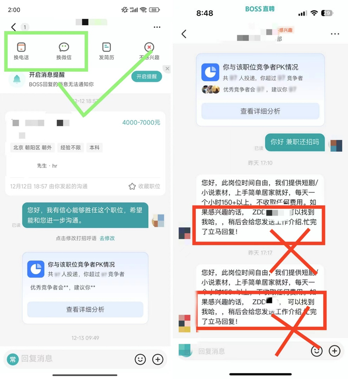 BOSS直聘安全官提醒:警惕通过微信、邮箱、电话等渠道“天降”的兼职机会。在BOSS直聘上沟通时,警惕上来就要微信、电话的招聘者,交换简历前可以打开简历隐私保护功能,隐藏简历中的联系方式。