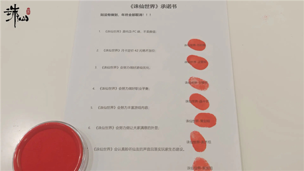 当时游戏官方微博还想了一记奇招,把和《 诛仙世界 》有关的各个团队都拉过来按了红手印,场面一度像是签署卖身契现场。