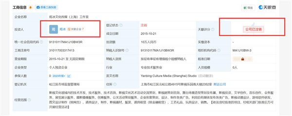 12月25日消息,据媒体报道,近日,由焉冰(大冰)担任投资人的焉冰文化传媒(上海)工作室发生工商变更,经营状态从存续变更为注销。