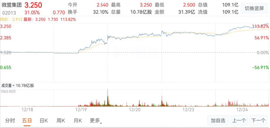 随后,公司股价连续多日大幅上涨,经过19日、20日、23日、24日四个交易日上涨后,公司股价累计涨超113.8%,股价翻倍,市值突破109亿元。