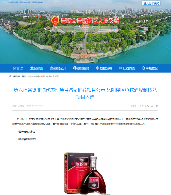 2023年11月13日,湖南省文化和旅游厅发布《关于第六批省级非物质文化遗产代表性项目名录推荐项目名单的公示》,岳阳楼区中医传统制剂方法(龟蛇酒配制技艺)项目入选,终于让百年前的中医制作技艺得以保存和流传,以及继续发扬光大,弘扬中医传统文化。