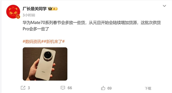 华为Mate 70系列一机难求!博主:从元旦开始货源会增加