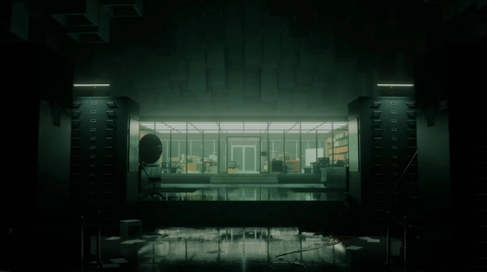 一个漆黑的房间里,隐约可见《控制》风格的清水混凝土,手电筒扫过去,密密麻麻全是阿兰·维克同款打字机,随之而来的还有噼里啪啦如耳鸣般交织的无数打字声。