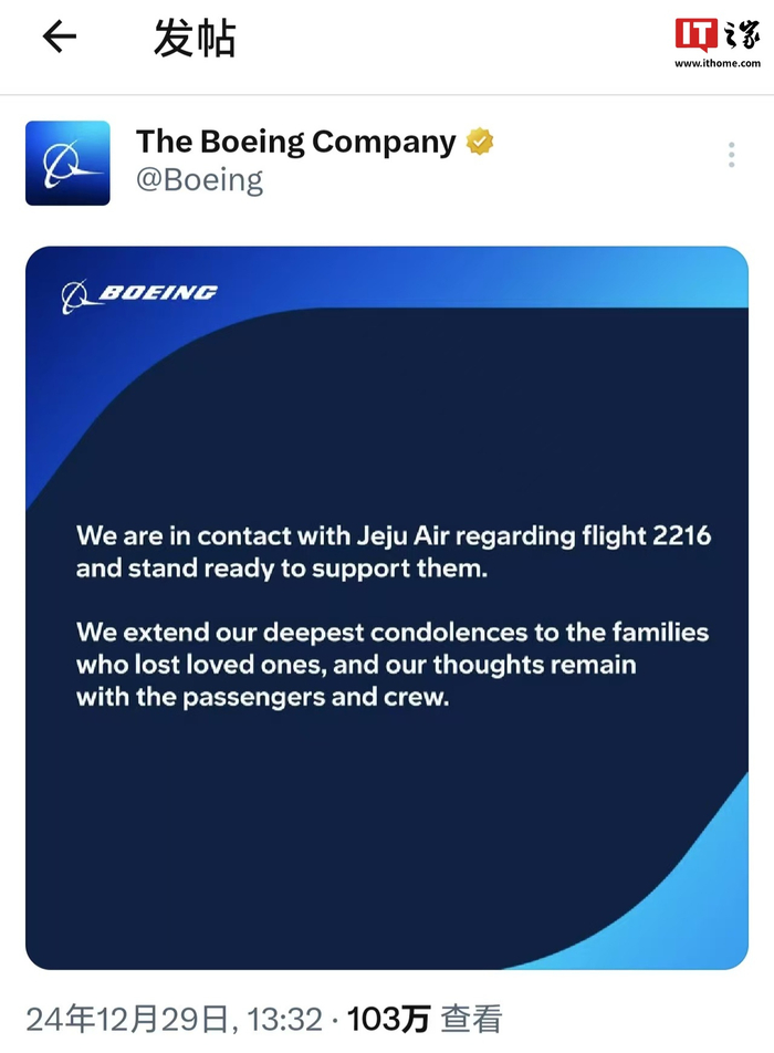 IT之家 12 月 29 日消息,美国波音公司今日在社交媒体上发文表示,该公司正就发生在韩国务安机场的 2216 客机航班事故与济州航空保持联系,并向遇难者家属表示慰问。IT之家附原文翻译如下: