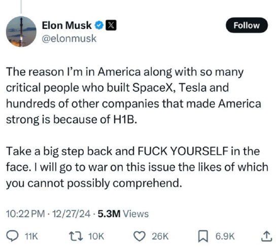 虽然特朗普还没有上任,他的这两派支持者已经爆发了激烈冲突。特朗普上周任命印度裔移民克里希南负责AI监管政策,引发了一些排外的极右派人士的不满,他们更开始攻击H-1B签证项目。看到自己好友遭受攻击,同样技术移民出身的马斯克挺身而出,开始与极右派人士展开激烈骂战。