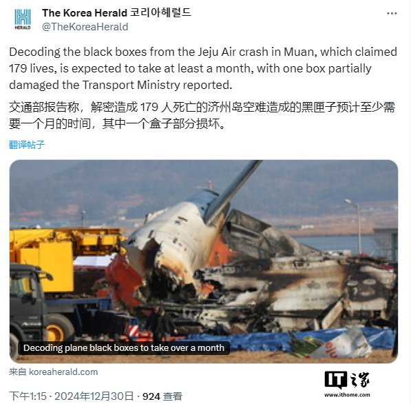 IT之家 12 月 30 日消息,据央视新闻报道,当地时间 12 月 30 日,韩国金浦机场试验分析中心对济州航空 7C2216 航班客机“黑匣子”开始展开数据分析。