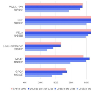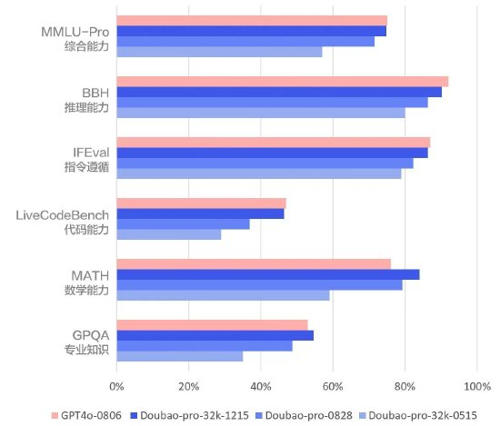 截至2024年12月,最新版豆包通用模型Doubao-pro-1215,综合能力较5月提升32%,已全面对齐GPT-4o,在数学、专业知识等部分复杂场景任务中,效果表现甚至更好。通过海量数据优化、提升模型稀疏度、引入强化学习、系统性工程优化等方式,团队大幅提升了Doubao-Pro理解精度和生成质量,并实现了性能与效率的平衡,推理服务价格仅为GPT-4o的八分之一。