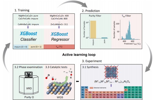 在该研究中,研究人员采用的主动学习策略由“训练-预测-实验”的多个循环组成。在每一个迭代后,使用 XGBoost 分类器来预测高熵氧化物的相纯度,以及来预测催化活性。