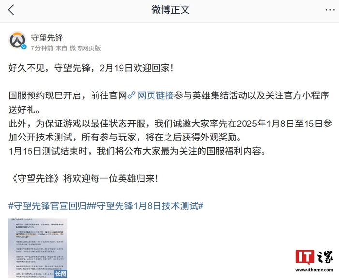 IT之家 12 月 31 日消息,暴雪《守望先锋》今日发文宣布,国服预约现已开启,将于 2 月 19 日正式回归。