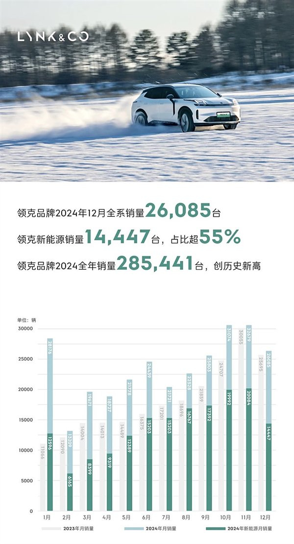 特别是在2024年12月,领克品牌全系销量为26085台,其中新能源车型销量达到14447台,占总销量的超过55%。