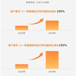 1月2日,T3出行正式对外发布了年度数据报告,对用户2024年出行消费特点进行了盘点。出行需求增长是2024年最明显的特点之一。报告显示,受节假日返乡叠加出游需要,2024年T3出行用户春节、五一、十一等假期打车出行呼叫量较2023年同期增长105%,其中异地出行呼叫量同比增长192%。