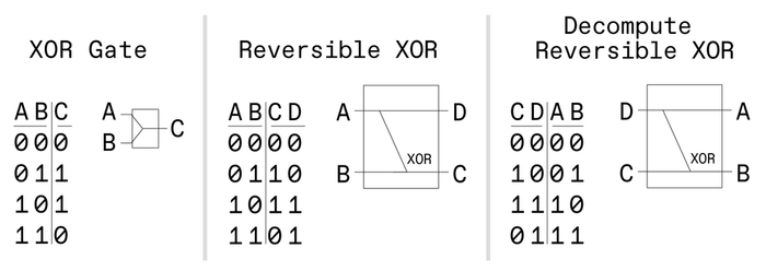传统的互斥 OR (XOR) 门是不可逆的 — 您不能仅通过知道输出来恢复输入。添加额外的 output,只是其中一个 inputs 的副本,使其可逆。然后,这两个输出可用于“反计算”XOR 门并恢复输入,以及计算中使用的能量。