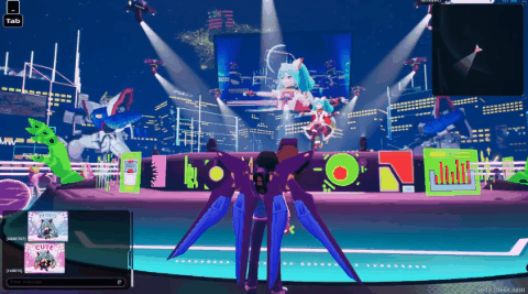 除去在台下欣赏演出和让虚拟形象摆出应援动作外,观众们还可以操作角色跳到浮空的台子上,从更好的角度来观看Live。从左下角刷屏的表情包来看,现场观众都很尽兴。如果要说有什么美中不足的地方,那就是两首高达主题曲都需要演唱者中气十足地飚高音,这本身就是合成人声的初音未来不太擅长的领域,实际的效果也多少有些“恐怖谷”。