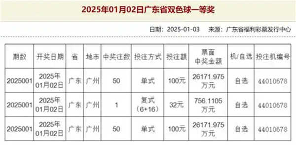 福彩双色球迎来2025年首期开奖,开奖公告显示,全国中一等奖的共108注,其中广州一站点独中101注。