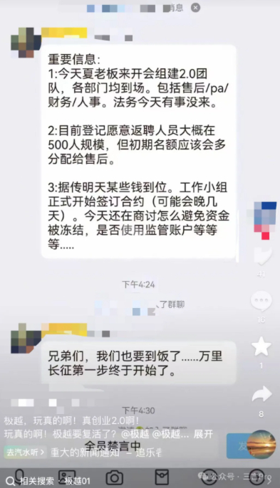 另外,据三言 Pro 报道,近期有网传聊天记录显示,极越汽车「创业2.0」要来了。