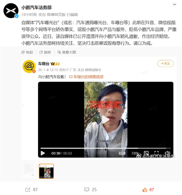 该自媒体发布的道歉声明显示:本人“汽车曝光台”、“车曝台”等账号的注册使用人,在此郑重向小鹏汽车道歉,并就此前发布的有关小鹏汽车的视频澄清说明。