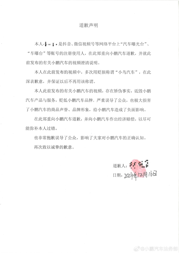 在此郑重向小鹏汽车道歉,并向小鹏汽车作出经济赔偿,以尽可能弥补本人过错。也非常抱歉误导了公众,影响了大家对小鹏汽车的正确认知。再次致以诚挚的歉意。