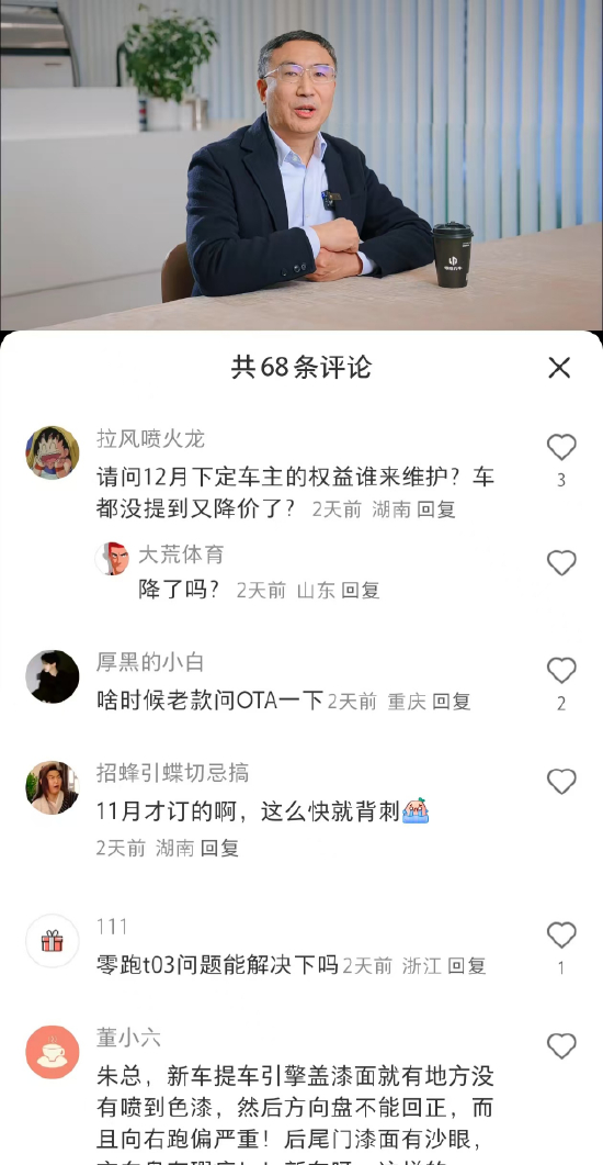 一面是销量创新高,一面是老车主吐槽,零跑可谓是水火两重天。在零跑汽车董事长朱江明的社交账号上,一些遭遇背刺的老车主也前往评论区发声,要求其重视老车主的权益。