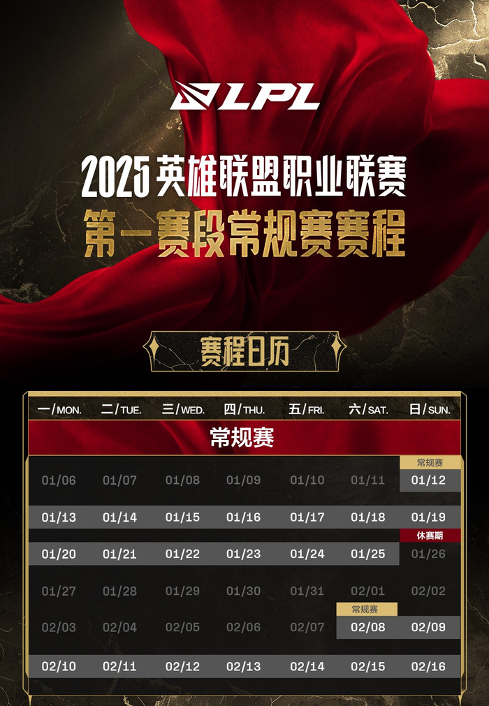 IT之家 1 月 6 日消息,《英雄联盟》赛事官方今日下午公布了 2025 英雄联盟职业联赛(LPL)第一赛段的常规赛赛程。本赛段的常规赛将从 1 月 12 日本周日开始,直到 2 月 16 日结束,期间经历 1 月 26 日~2 月 7 日的春节休赛期。