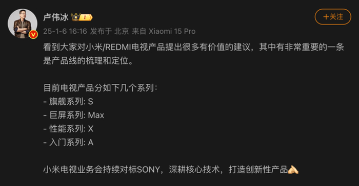 随后,卢伟冰回应网友留言并称,小米电视业务会持续对标 SONY,深耕核心技术,打造创新性产品。同时卢伟冰还梳理了小米电视的产品线与定位。