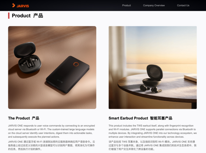 据官方介绍,主体包括电池、指纹识别、Wi-Fi、麦克风和蓝牙模块,用户只需触摸并按住指纹识别区域即可激活语音命令,同时该设备通过蓝牙或 Wi-Fi 连接到加密的云服务器来响应用户语音命令。配套的 TWS 耳机通过蓝牙与本体连接,并且「JARVIS ONE」本体支持通过蓝牙与多个设备同时连接。