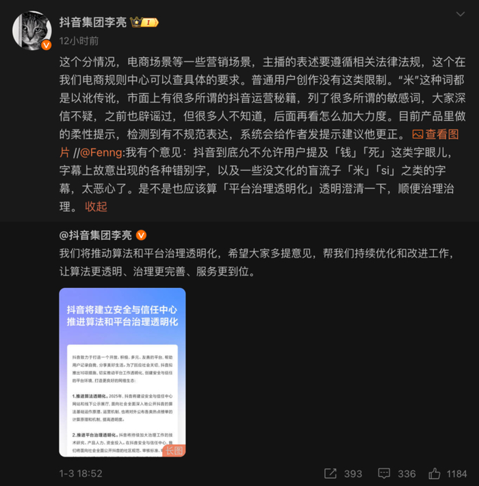 李亮发文后,有网友就「敏感词限流」提出反映:抖音的视频中经常将「钱」读成「米」。随后李亮回应,抖音普通用户使用敏感词不会被限流。李亮补充说明,为什么有些情况表达会有限制,其原因是不同内容要遵循不同的规范。