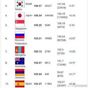 据悉,该榜单根据全球近140万人的测试结果得出,伊朗以106.63排名第二,韩国以106.57排名第三,美国国民均值100.17,排名第二十七位。