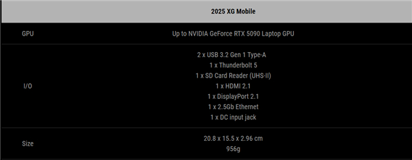 XG Mobile 2025配备了HDMI 2.1和DisplayPort 2.1接口,支持连接两台显示器,同时还提供了两个10Gbps的USB-A端口、一个SD卡读卡器以及5Gbps的以太网接口。