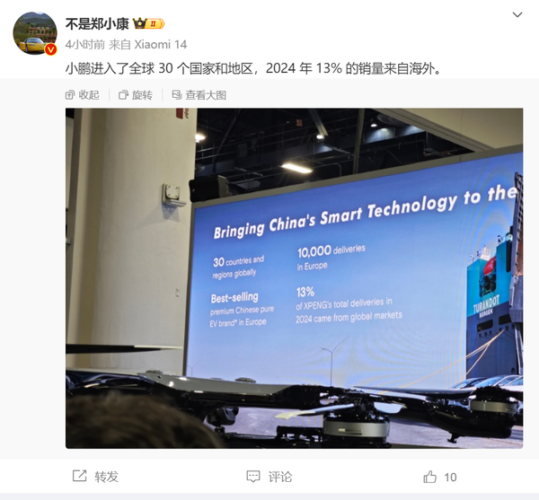 小鹏汽车总裁顾宏地:2024年海外销量占比达到13%