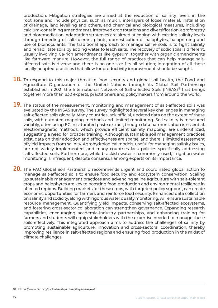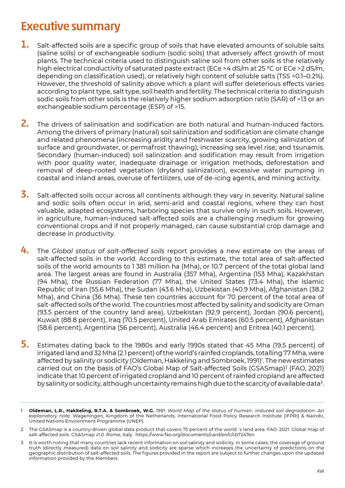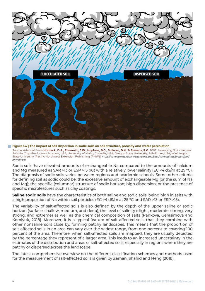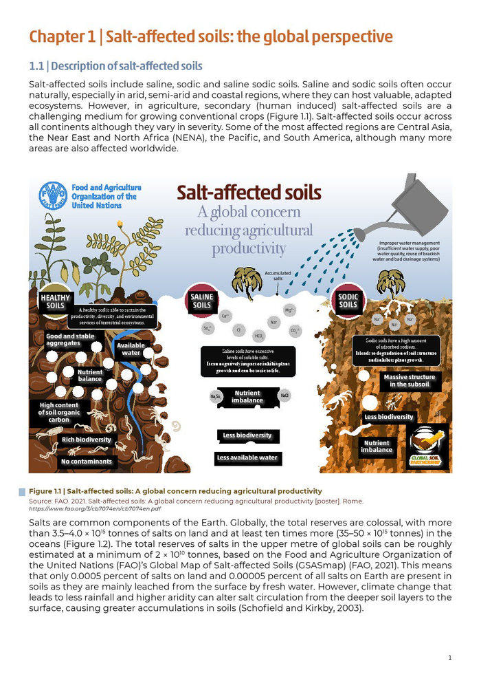 联合国粮农组织发布了“全球盐渍土壤状况报告”。受盐影响的土壤是一种特定的土壤,其可溶性盐(盐渍土壤)或交换性钠(钠质土壤)的含量升高,对大多数植物的生长产生不利影响。用于区分盐渍土与其他土壤的技术标准是饱和膏体提取物的相对高电导率,或相对高的可溶性盐含量。超过对植物有害影响的盐度阈值因植物类型、盐类型、土壤健康和肥力而异。