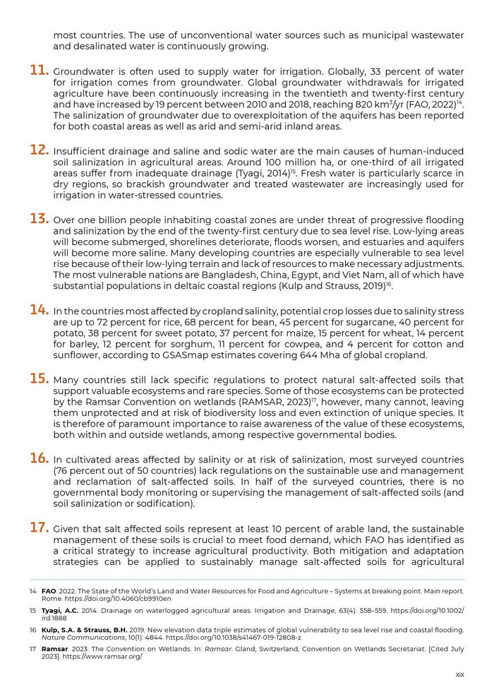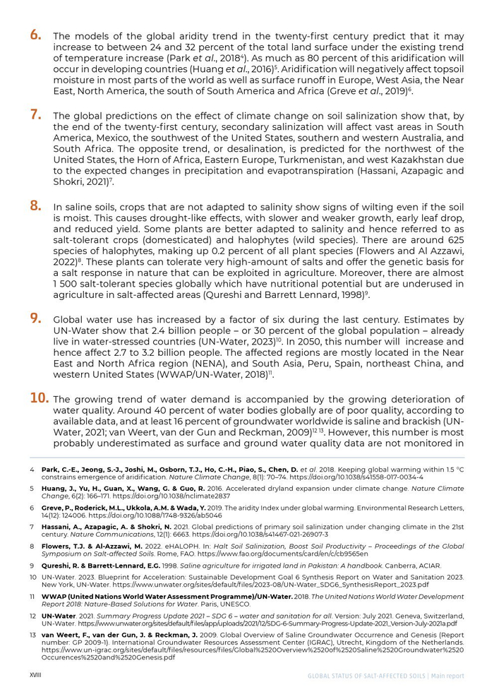 追溯到20世纪80年代和90年代初的估计表明,世界上45万公顷(19.5%)的灌溉土地和32万公顷(2.1%)的雨养农田,共计77万公顷受到盐碱化的影响。10%的灌溉农田和10%的雨耕地受到盐碱化或碱化的影响,尽管由于现有数据的缺乏,不确定性仍然很高。