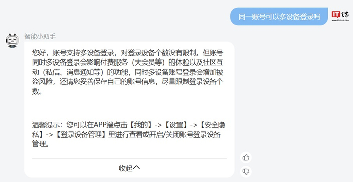 IT之家随后询问B站客服“智能小助手”获悉,大会员账号支持多设备登录,对登录设备个数没有限制。但账号同时多设备登录会影响付费服务(大会员等)的体验以及社区互动(私信、消息通知等)的功能,同时多设备账号登录会增加被盗风险。