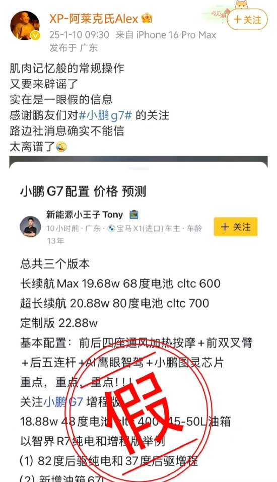 小鹏汽车发文辟谣网传G7售价及配置信息
