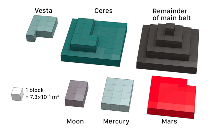 除了贵金属外,小行星上的基础金属,比如铁(Fe)、镁(Mg)、铝(Al)、硅(Si)这些,它们作为太空建造的基础材料仍然极具价值。未来,无论是建造太阳能板、空间站甚至是外星基地等,这些都离不开基础金属材料。虽然这些金属大多也是以氧化物的形式存在,想要投入使用需要先经过一系列处理,但是当技术和时机都成熟后,相比从遥远的地球一点点运过来,就地取材一定是那时的最佳方案。更关键的一点是,小行星带的可采矿量要远大于内太阳系的其他天体。科学家计算,仅就谷神星来说,理论上它的可开采矿储量比火星加水星再加上月球三者还要多。可以预见,小行星带绝对会成为未来的兵家必争之地。