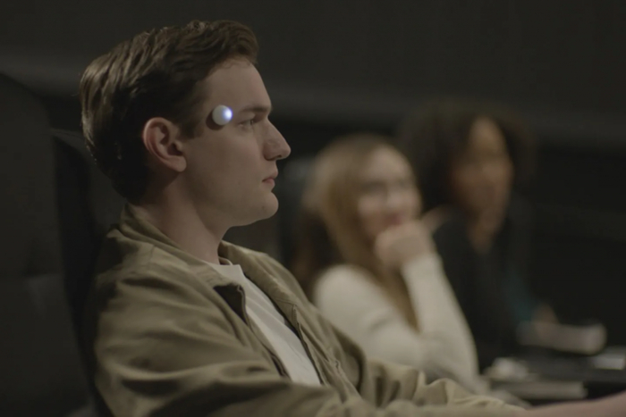 注意看,眼前这个男人,他将一个形如白色纽扣的装置粘在了太阳穴上,然后闭上眼睛,脑海中默念一个问题:你觉得 The Verge 作为一个新闻媒体网站怎么样?十五秒后他的手机弹出一个通知推送,点开全是一些关于 The Verge 新闻公信力的信息。