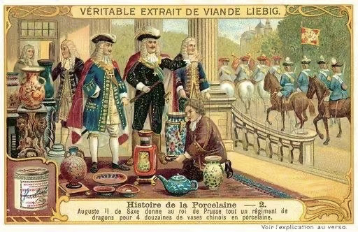 上图描绘的是1717年波兰国王奥古斯特二世拿600名龙骑兵跟普鲁士摄政王威尔·汉姆一世交换了151件东方瓷器,龙骑兵指的是装备火枪的高级骑兵,价值不菲。因为这件事他得名“瓷王”,他在生前还有句名言:“君王通过建筑实现不朽。”展现了他对文化的重视。