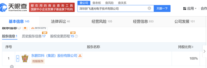 蓝鲸新闻1月14日讯(记者 翟智超)据天眼查App信息显示,日前,深圳新飞通光电子技术有限公司发生工商变更,原股东NEOPHOTONICS CORPORATION LIMITED退出,新增东鹏饮料(集团)股份有限公司全资持股。