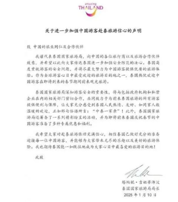1月11日,泰国国家旅游局官方账号发布《关于进一步加强中国游客赴泰旅游信心的声明》,泰国国家旅游局局长塔帕妮希望中国人对赴泰旅游依旧充满信心,相信泰国已做好充分的准备迎接每一位中国游客。