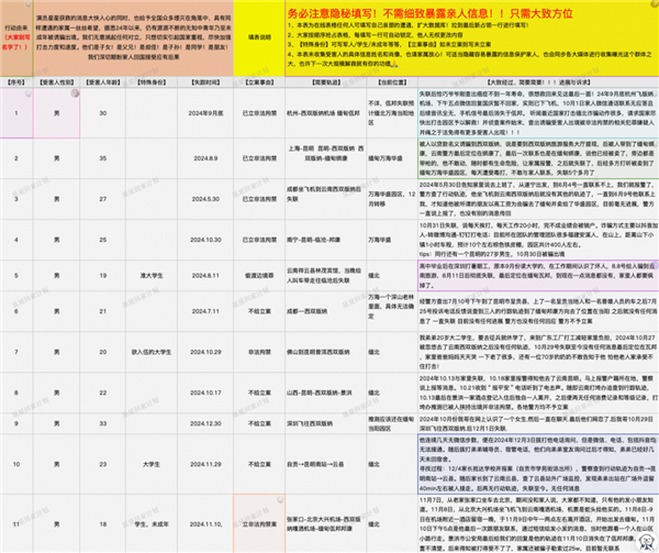 他们用在线文档统计被困人员信息,每一行需要填写的内容包括受害人性别、年龄、失踪时间、立案事由、简要轨迹、当前位置、大致经过、进展、诉求等信息。