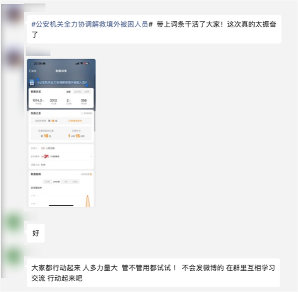 当天晚上,阿戴还在群里呼吁大家去微博词条互动,人工给词条加热: “ 当时我还想着,希望这一天别发生什么大事 ” 。