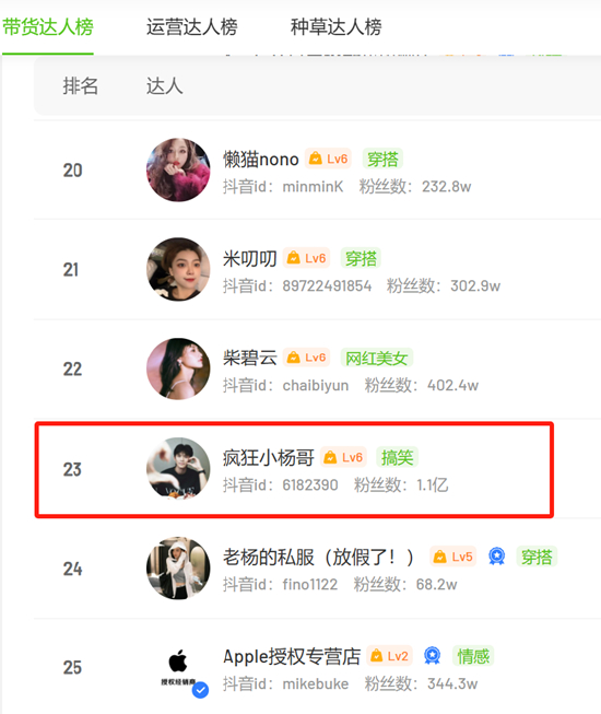 根据飞瓜数据,在2023年的抖音带货达人榜中,小杨哥名列第7位,不过由于2024年年底整整一个季度完全退出带货,小杨哥全年的带货销售额相比往年大打折扣,在带货达人榜中跌至第23位。