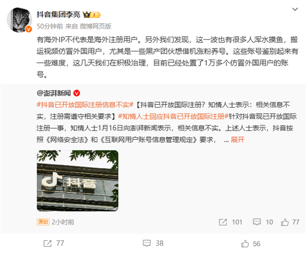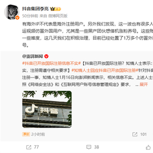 李亮回应抖音大量用户IP显示海外:一些黑产团伙想借机涨粉养号