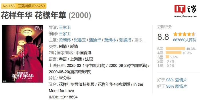 原版《花样年华》于 2000 年上映,截至IT之家发文,该电影豆瓣评分 8.8,在豆瓣电影 Top250 榜单中排名第 153。