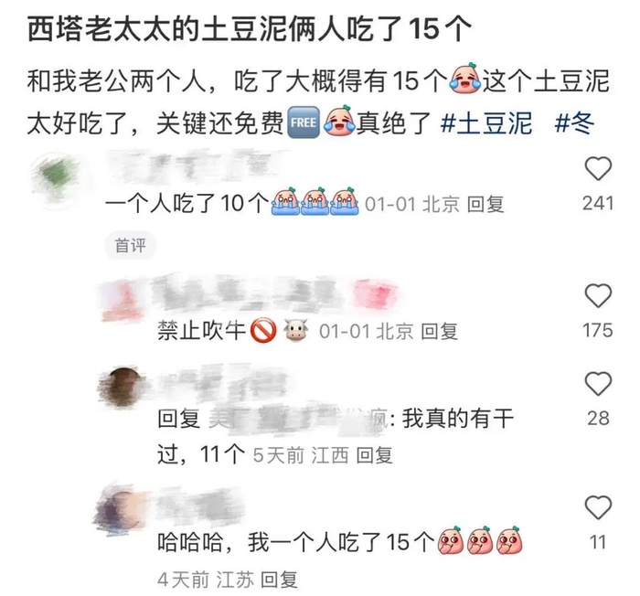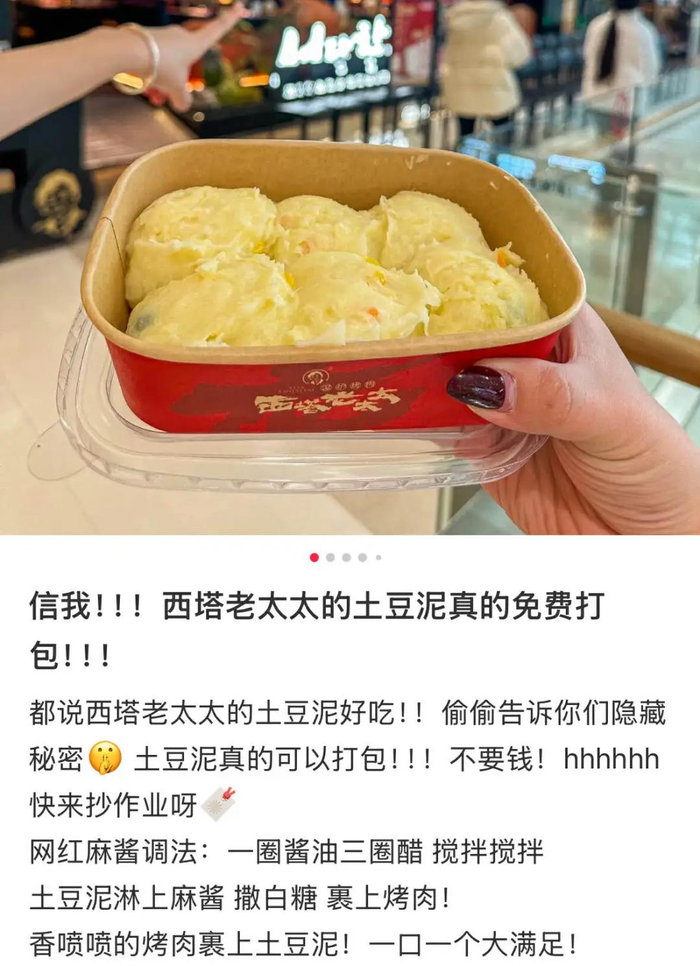 在社交平台上,金老太最火的是免费土豆泥,有人一次最多吃16个,有人外带打包一满盒。所谓“西塔老太太最好的不是烤肉,而是免费的土豆泥”,不少测评博主放出豪言:去西塔老太太为的就是这细腻浓郁的土豆泥。