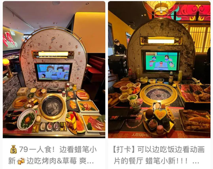 肉问屋把个别门店装修成东京地铁吸引打工人,还有日式烤肉店做成一人食,你可以一边吃烤肉一边看蜡笔小新。