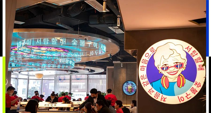 西塔老太太是一家朝鲜族烤肉连锁品牌。烤肉店总喜欢和“烟火气”挂钩,解冻的生肉流着血水,滋啦滋啦的烤制冒着浓烟,你拿着钳子一边翻烤着腌好的肉,一边把自己也腌入味儿,从头到脚、从里到外全身吸满了百分百油烟。