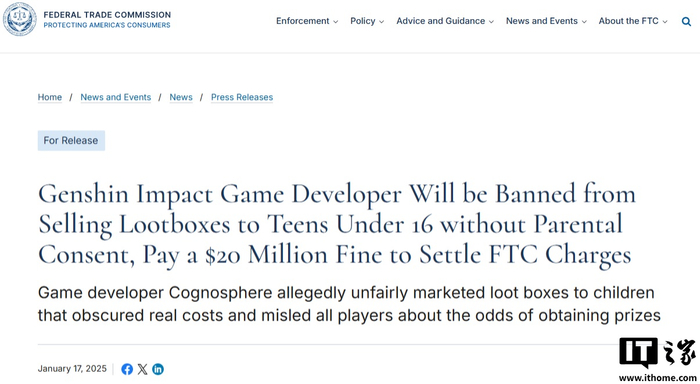 IT之家 1 月 18 日消息,当地时间周五,美国联邦贸易委员会(FTC)发布公告,称其已与《原神》开发商“米哈游”达成和解,原因是《原神》的抽卡机制涉嫌“欺骗性营销”并违反未成年人隐私保护法。