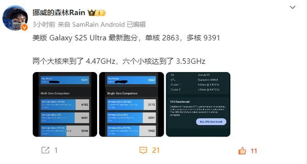 根据此前曝光的跑分信息来看,三星Galaxy S25 Ultra的Geekbench 6单核成绩为2863,多核成绩为9391,符合该芯片的表现。